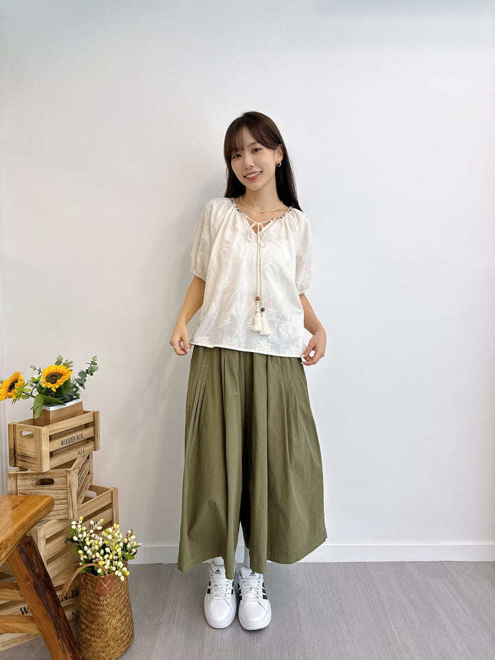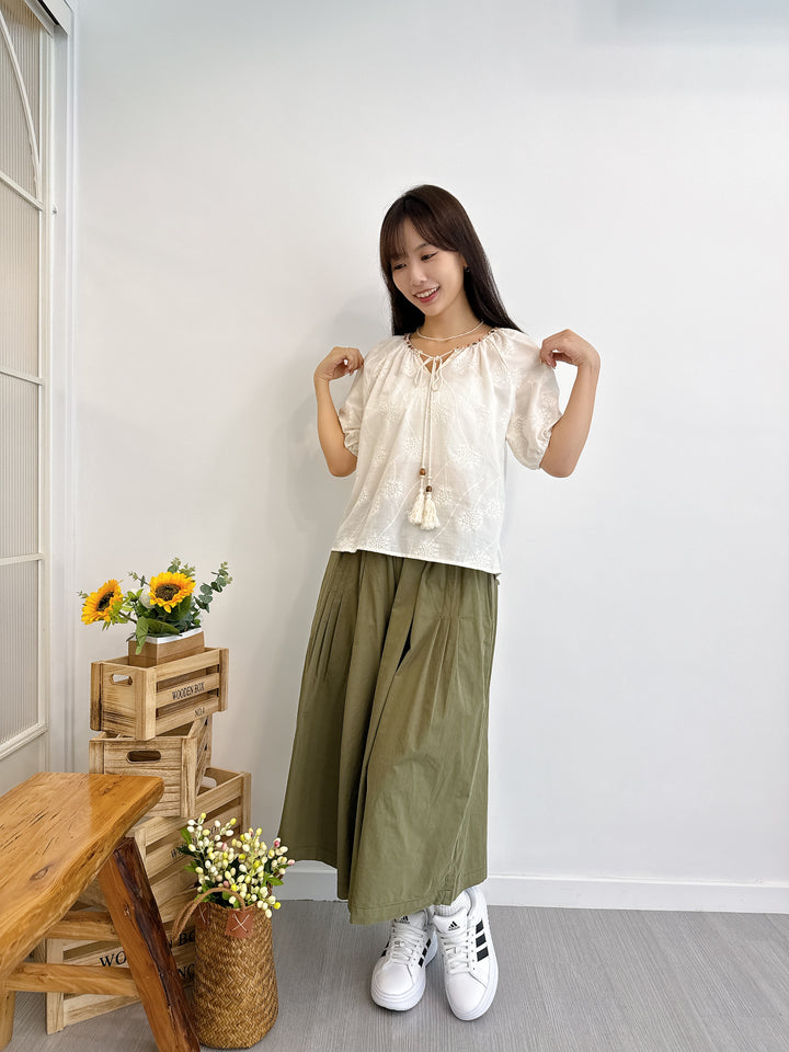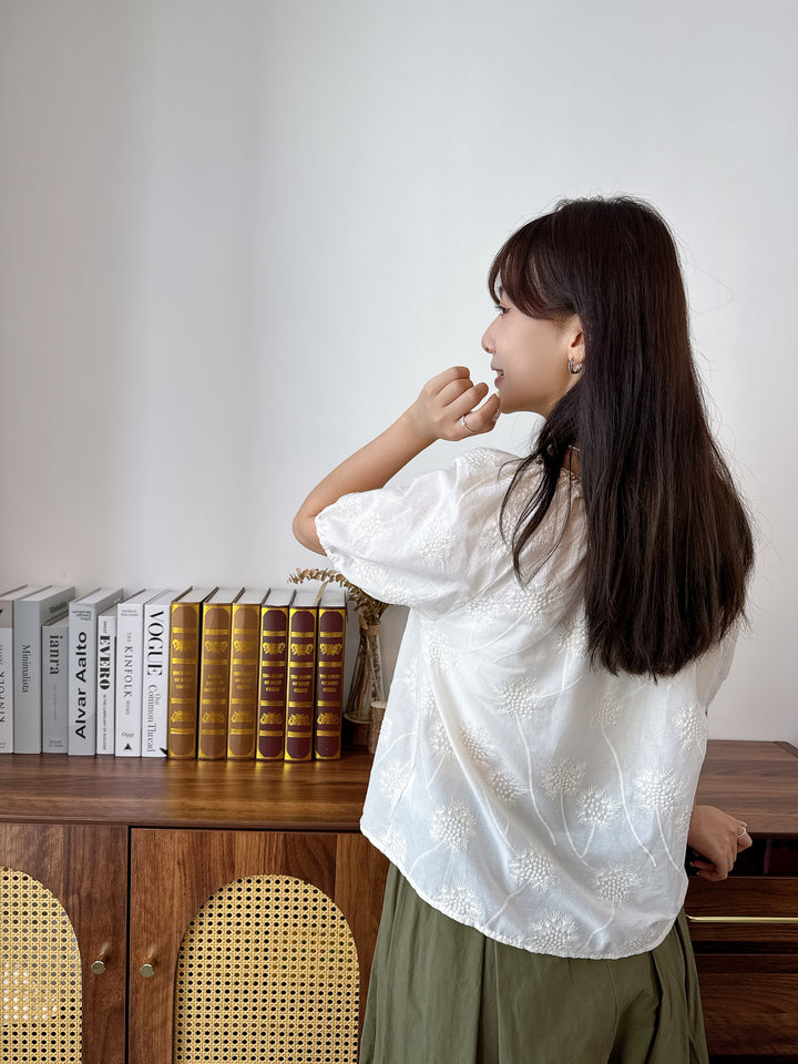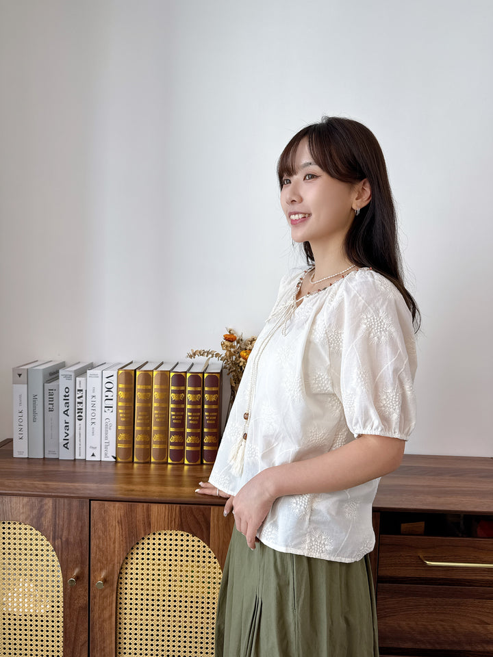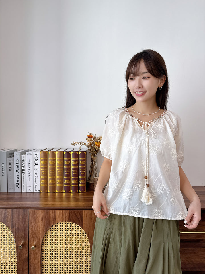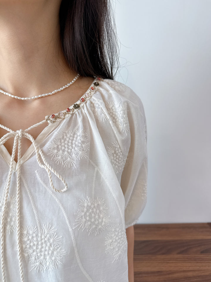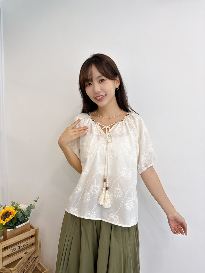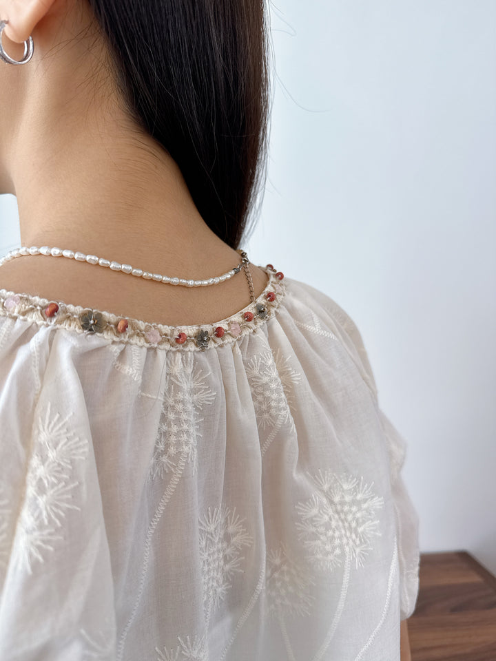 2506088 TU Flower Emb. Beaded Neck Blouse
